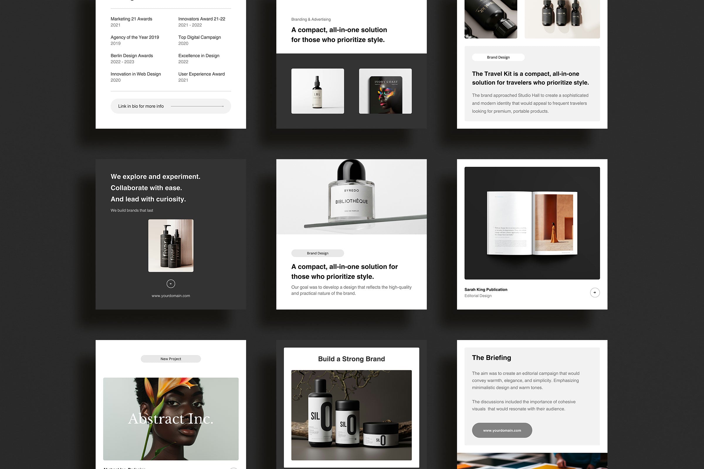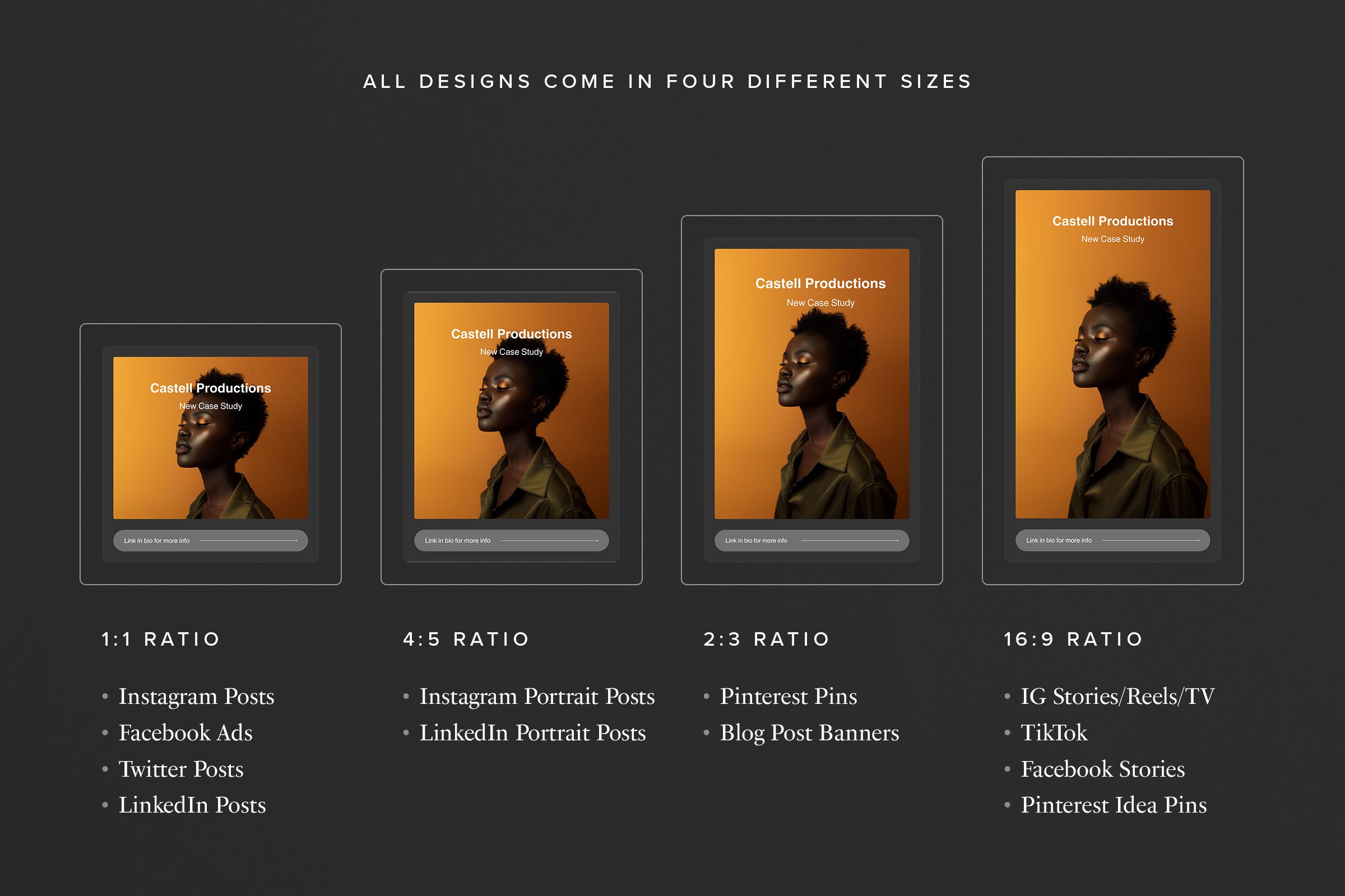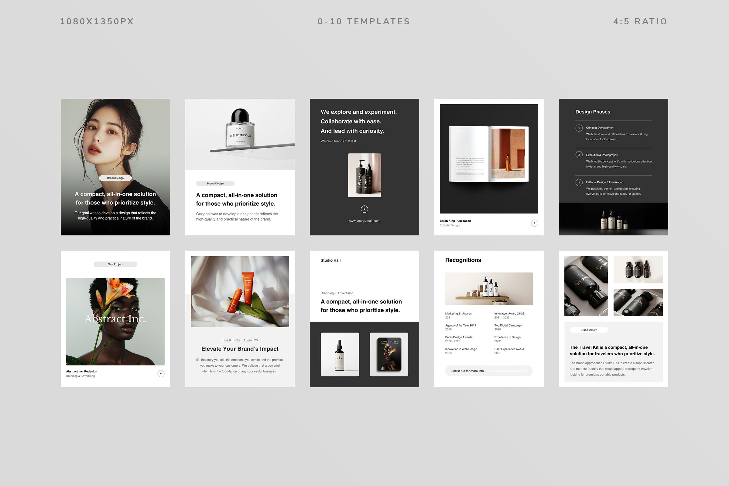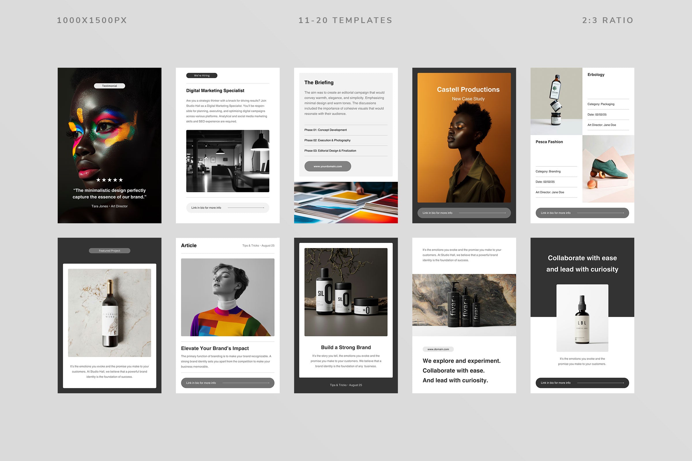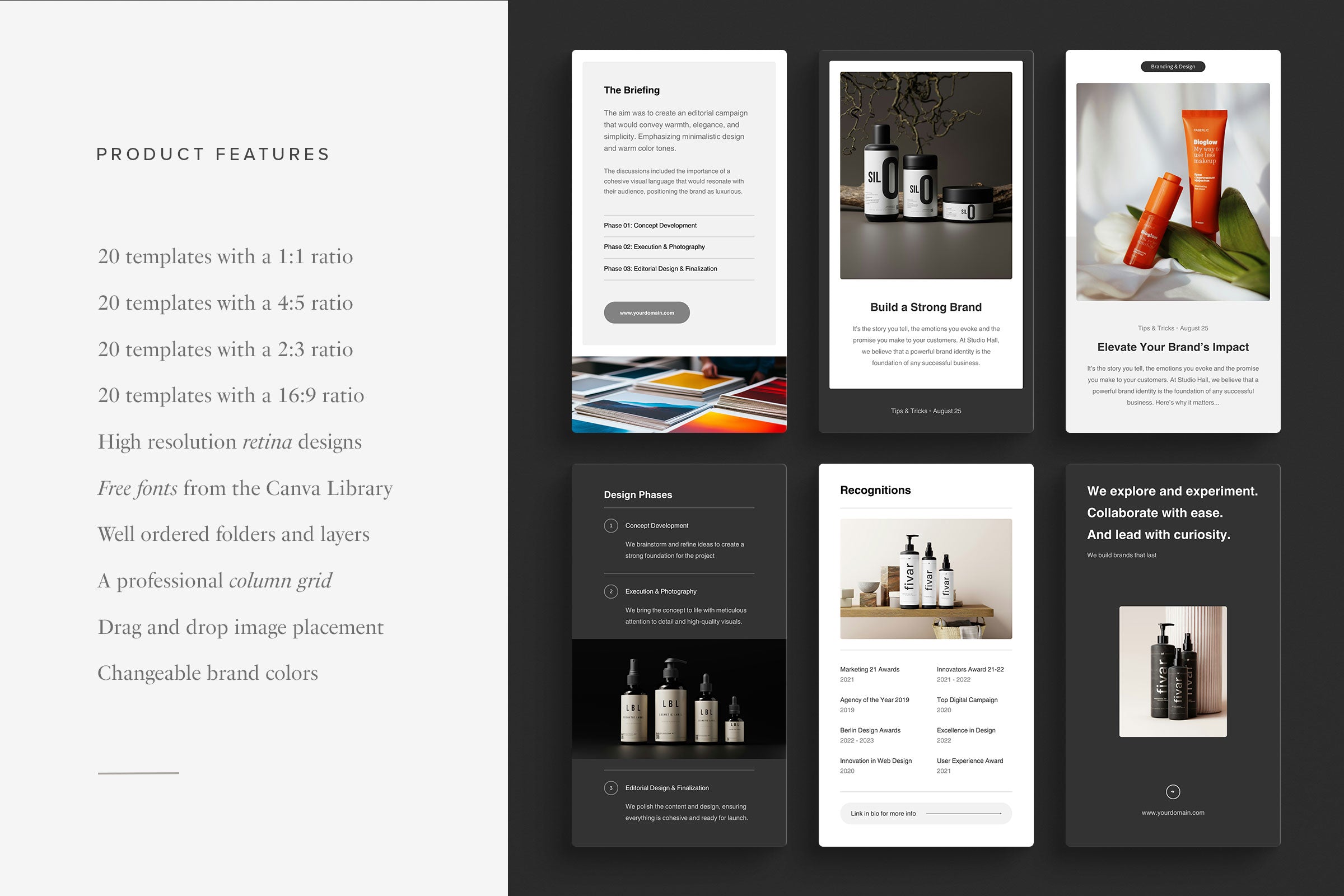 This kit contains 80 easy-to-edit social media templates (for sizes and ratios included see below). Every template is professionally designed and fully customizable with the free and user-friendly Canva editor. Create your own templates in minutes by dragging and dropping your images and adjusting the placeholder text and brand colors. All free fonts from the Canva Library are included. With these templates you can easily upgrade your social media in a stylish and professional way!