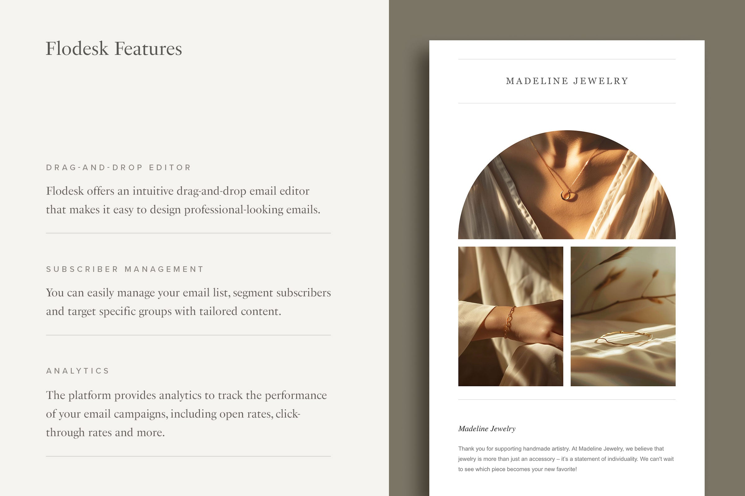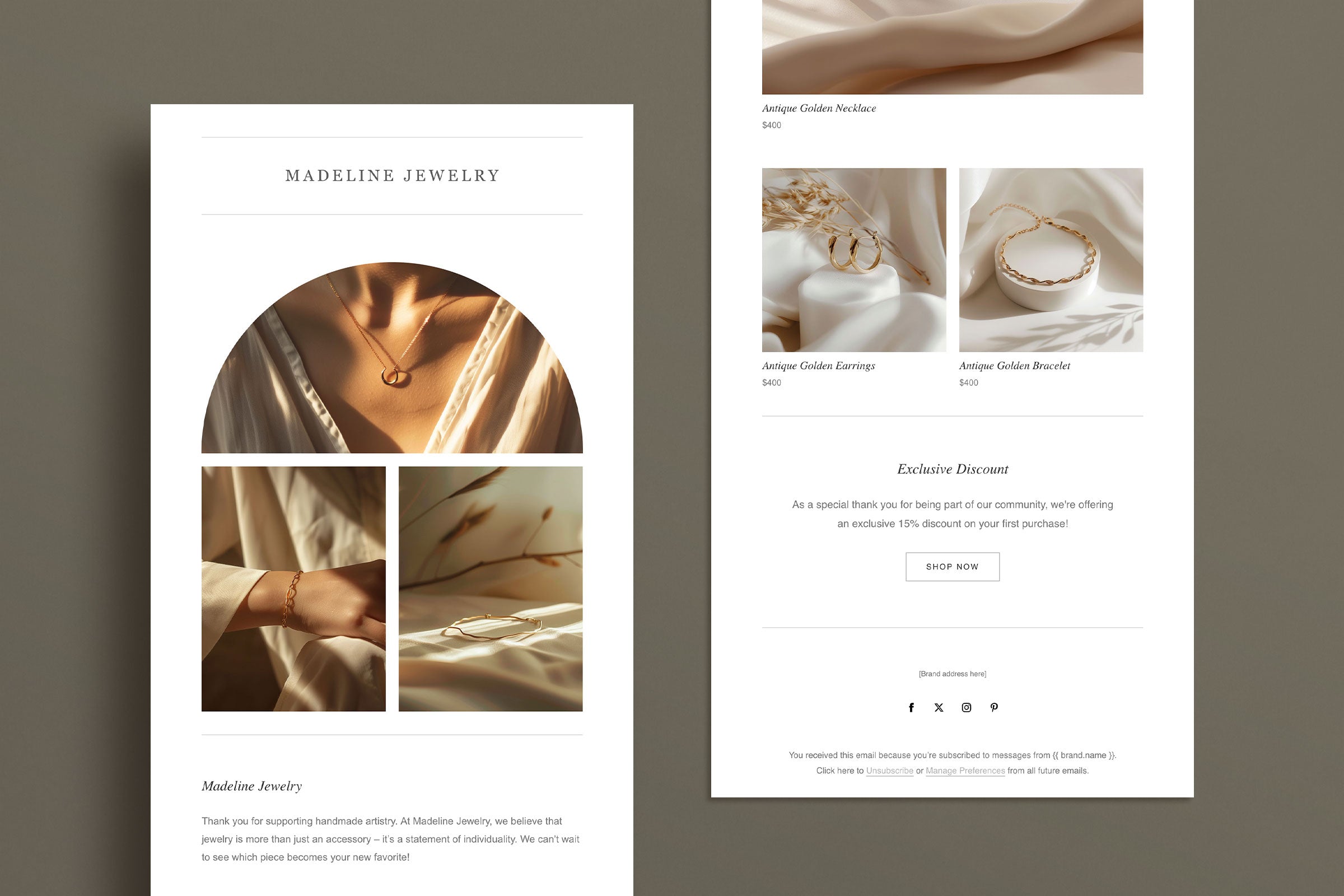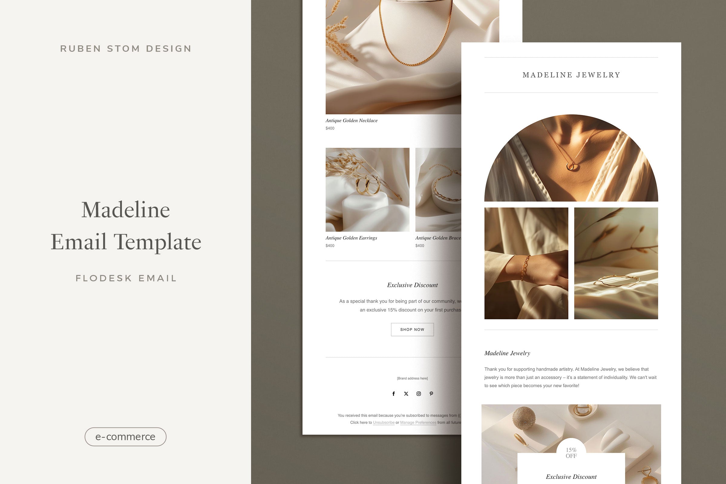 The Madeline Ecommerce Email Template is an ecommerce template designed to elevate your email marketing and showcase your products. The template aims for an elegant, feminine style, which is reflected through the use of lines, dividers and whitespace.