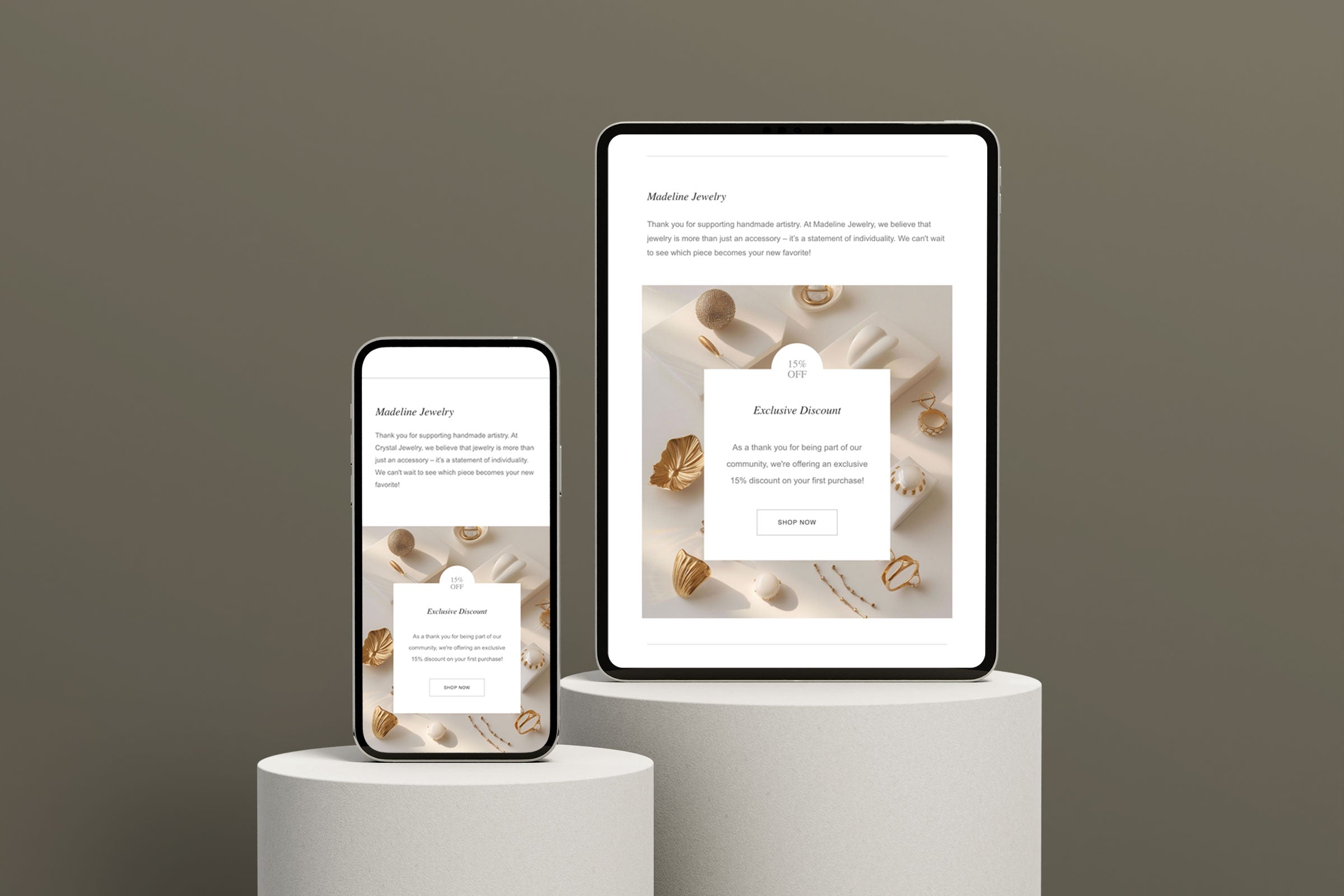 The Madeline Ecommerce Email Template is fully customizable, allowing you to effortlessly adjust the colors, fonts and layout to perfectly align with your brand's identity and share your story with style and elegance. Whether you're looking to share your newest products or simply keep your audience in the loop, the Madeline Ecommerce Email Template provides a seamless way to connect with your subscribers and showcase products.