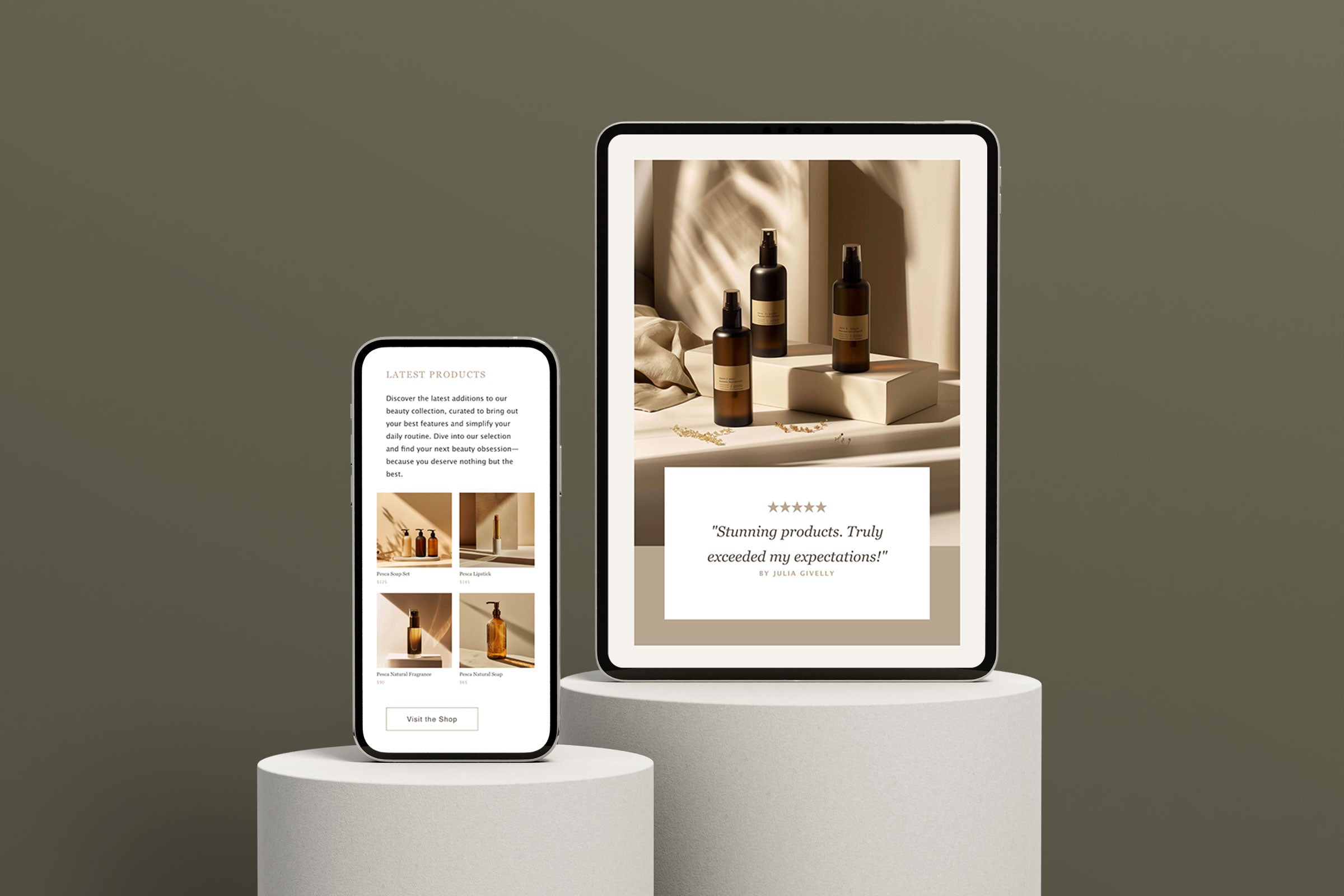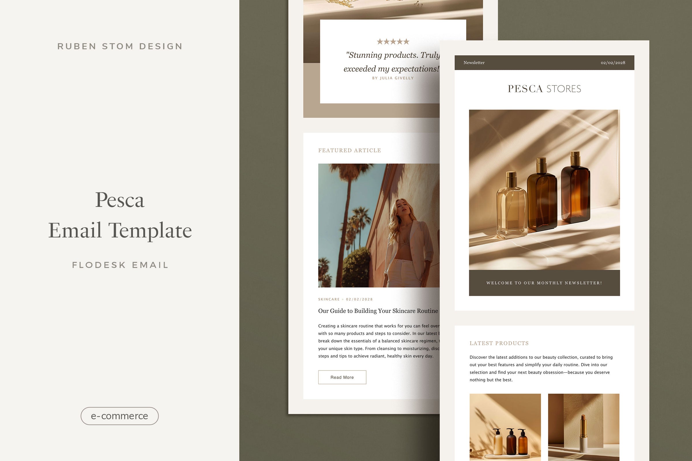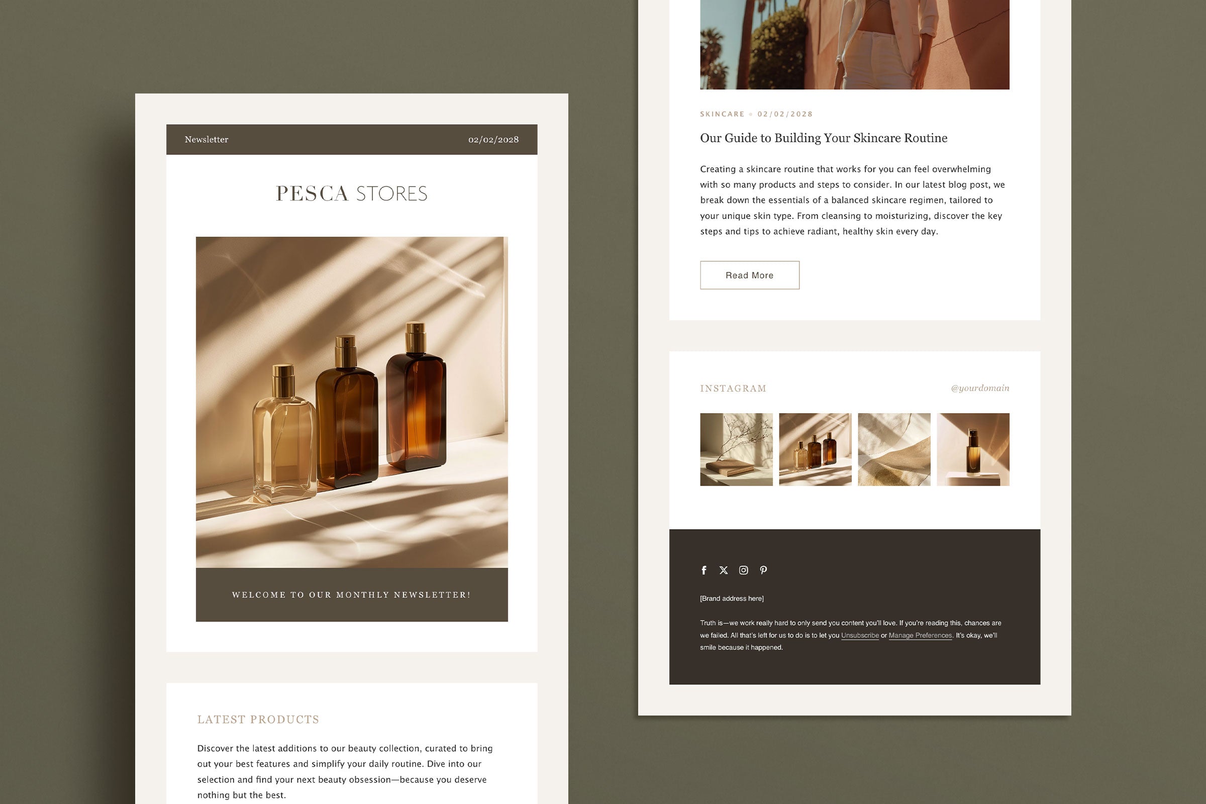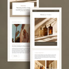 The Pesca Ecommerce Email Template is an ecommerce template designed to elevate your email marketing and showcase your products. The template aims for an elegant, feminine style, which is reflected through the use of elegant fonts, white space and warm color tones.