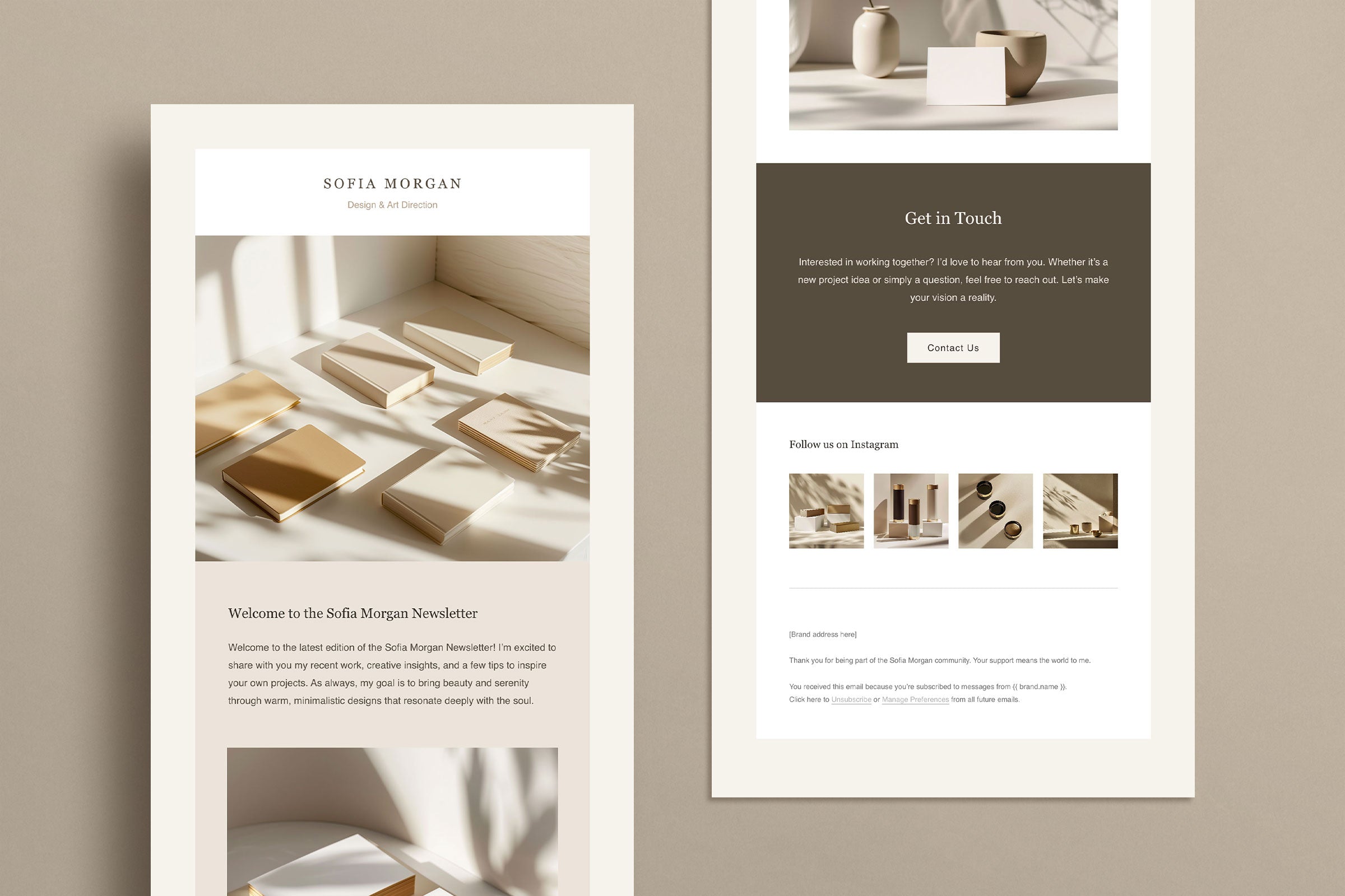 The Sofia Morgan Email Template is a newsletter template designed to elevate your email marketing and showcase your creative work. This template provides a strong focus on imagery that puts your work in the spotlight. The Sofia Morgan Email Template is fully customizable, allowing you to effortlessly adjust the colors, fonts and layout to perfectly align with your brand's identity and share your story with style and elegance.
