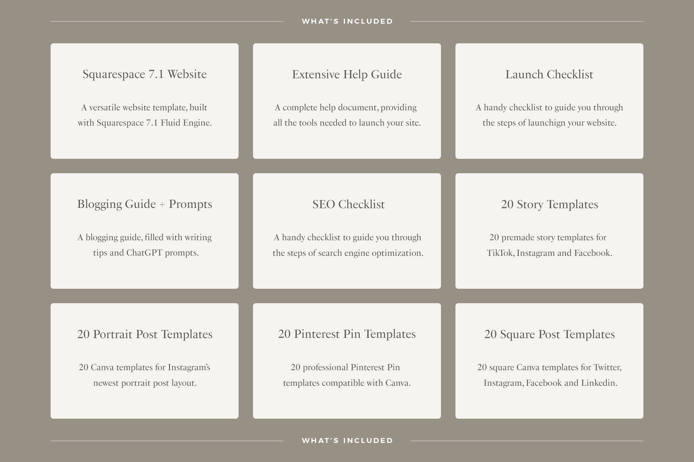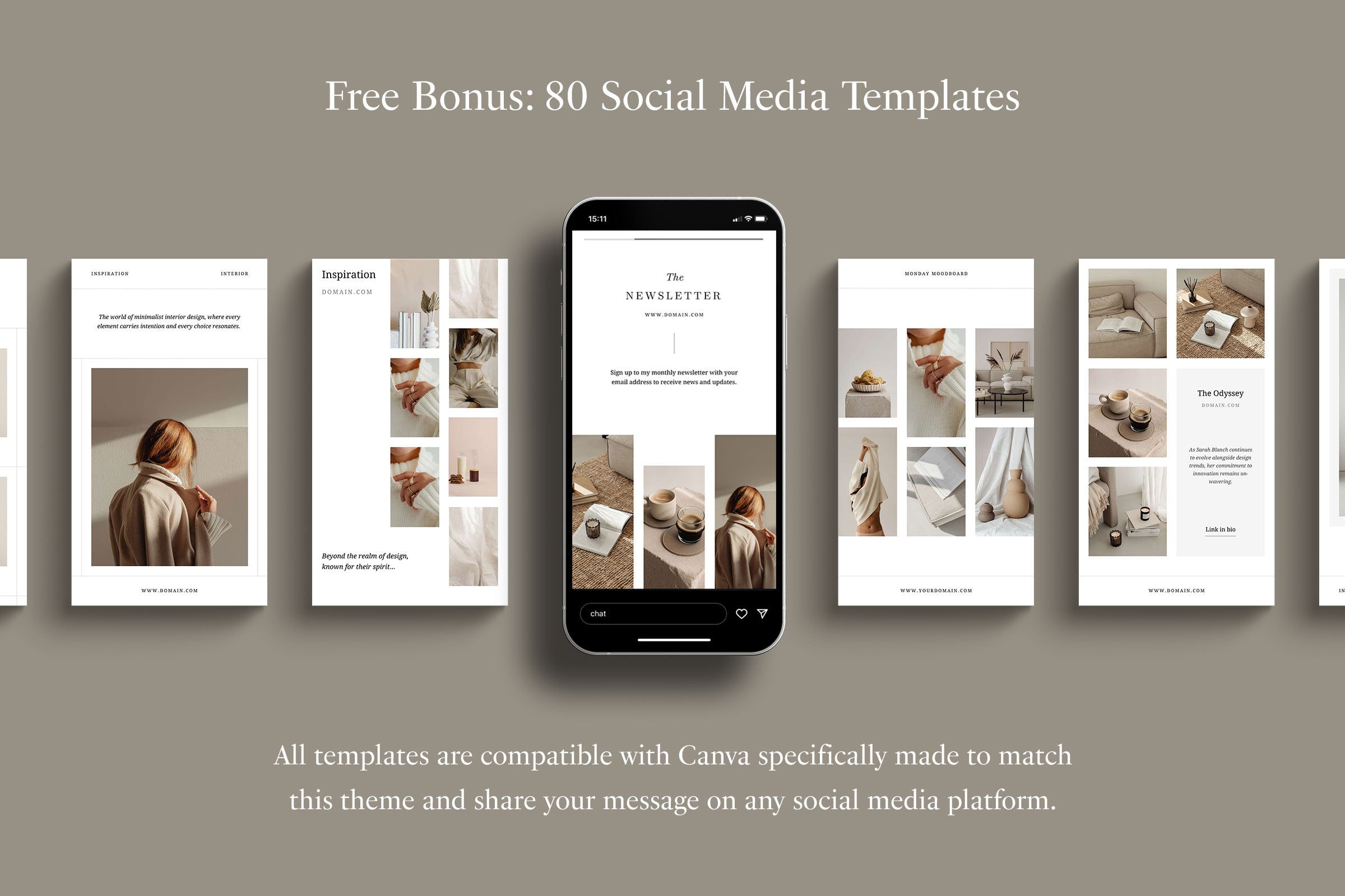 Als Bonus sind im Download 80 vorgefertigte Social-Media-Vorlagen für Canva enthalten, darunter 20 Story-Vorlagen, 20 quadratische Vorlagen, 20 Vorlagen im Hochformat und 20 Pinterest-Pin-Vorlagen. Diese Vorlagen sind im Stil Ihrer Website gestaltet und erleichtern die Werbung für Ihre neue Website und Ihr Unternehmen auf allen Ihren Social-Media-Plattformen.