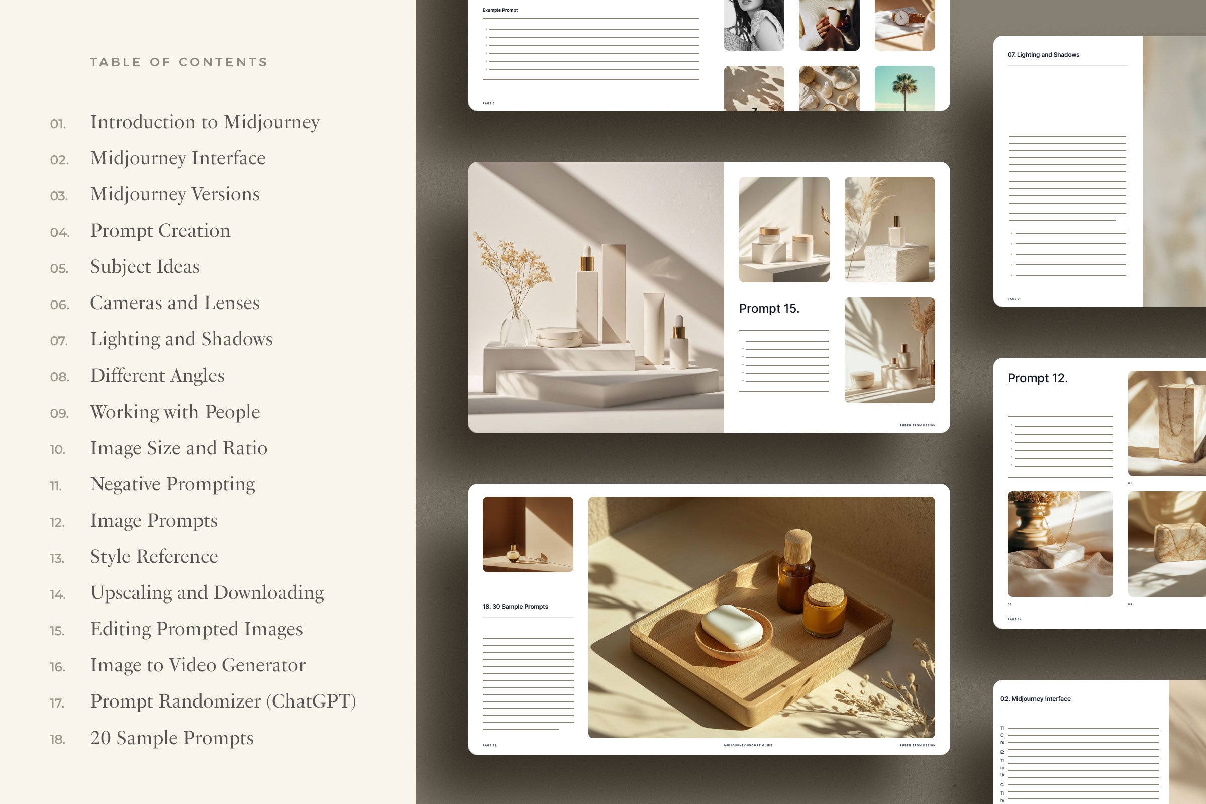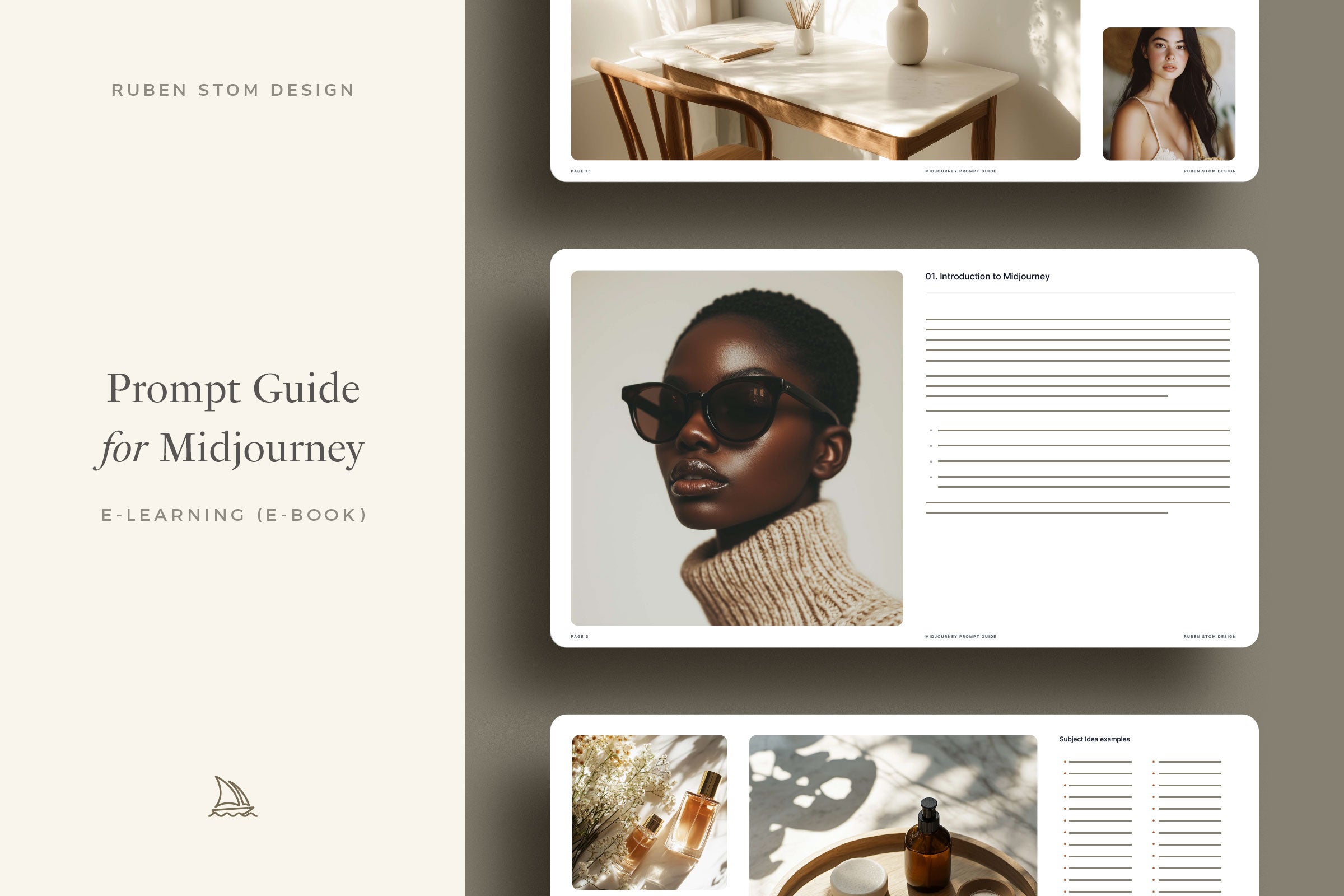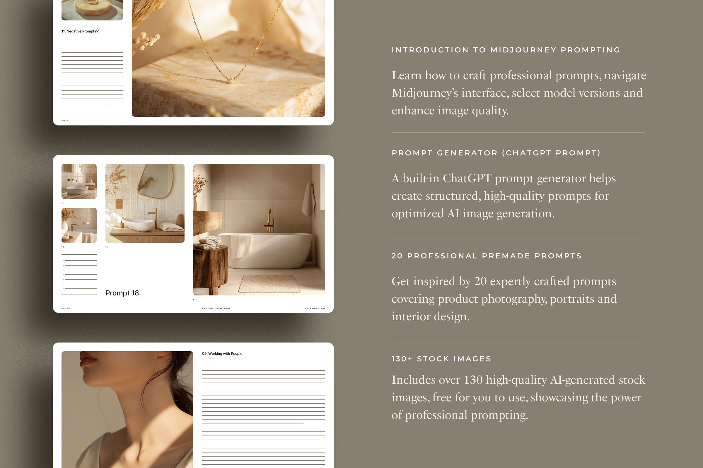 Below, you will find all the chapters covered in this ebook, in addition to the 130+ stock photos. These topics will guide you through every step of creating professional images with Midjourney.