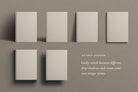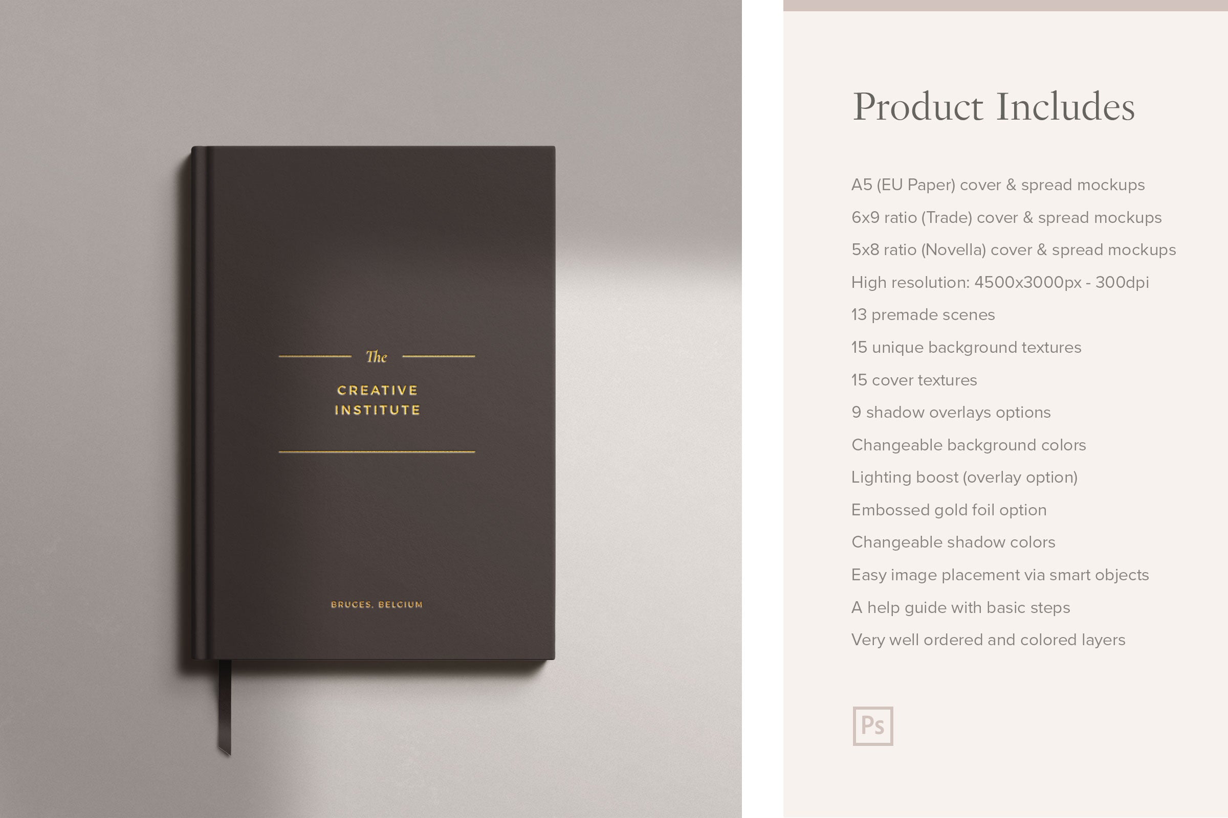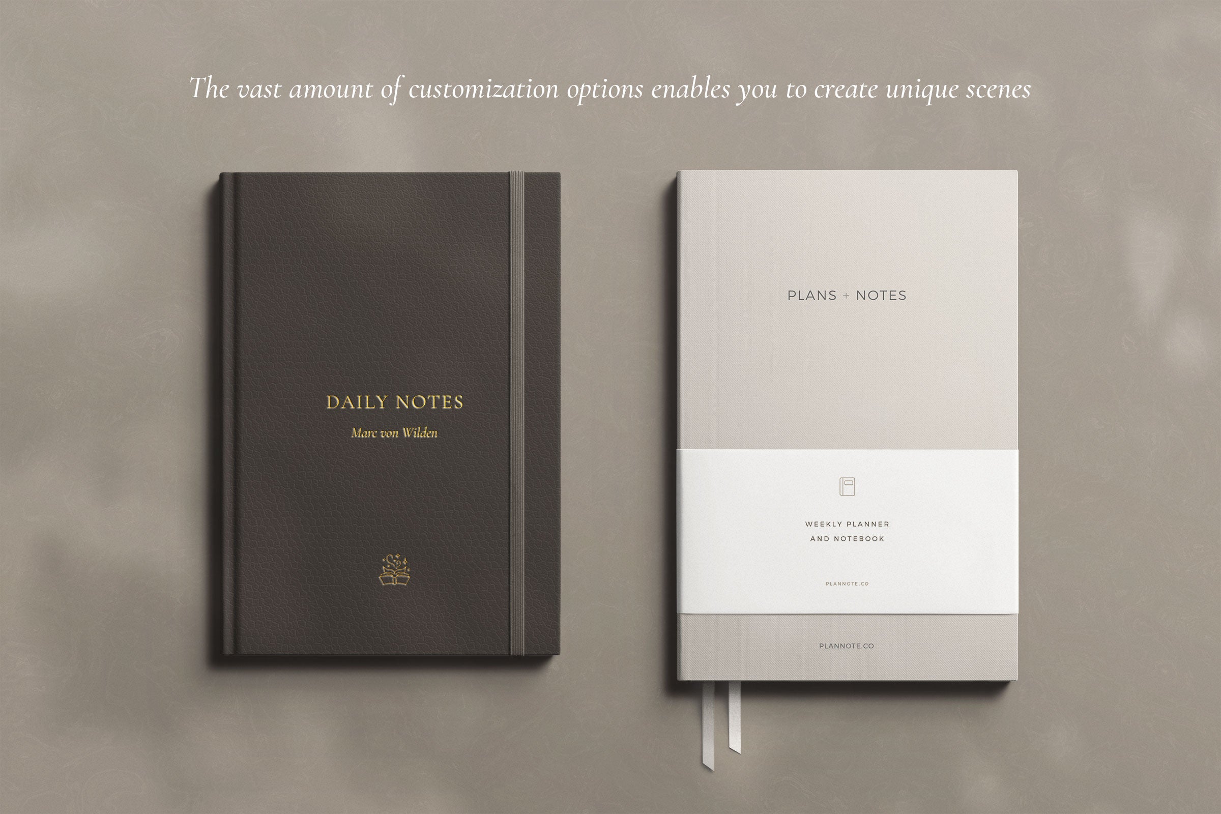Hierbei handelt es sich um einen hochauflösenden Notizbuch- und Buchszenen-Ersteller, der mit Adobe Photoshop kompatibel ist und sich durch sein natürliches Aussehen und viele Optionen auszeichnet. Sowohl das Cover als auch die Spread-Mockups sind in drei verschiedenen Größen erhältlich: A5, 6x9-Format und 5x8-Format. Der Download bietet 13 vorgefertigte Szenen, 15 Hintergrundtexturen, 9 Schattenüberlagerungsoptionen und vieles mehr! Die Modelle lassen sich sehr einfach anpassen, indem Sie Ihre Kunstwerke einfach über intelligente Objekte platzieren und die Beleuchtungs-, Textur- und Schattenoptionen umschalten. Es gibt auch eine Hilfeanleitung mit den grundlegenden Schritten zur Verwendung dieses Produkts. Durch die zahlreichen Möglichkeiten, diese Modelle an Ihre eigenen Bedürfnisse anzupassen, können Sie realistische und authentische Szenen erstellen.