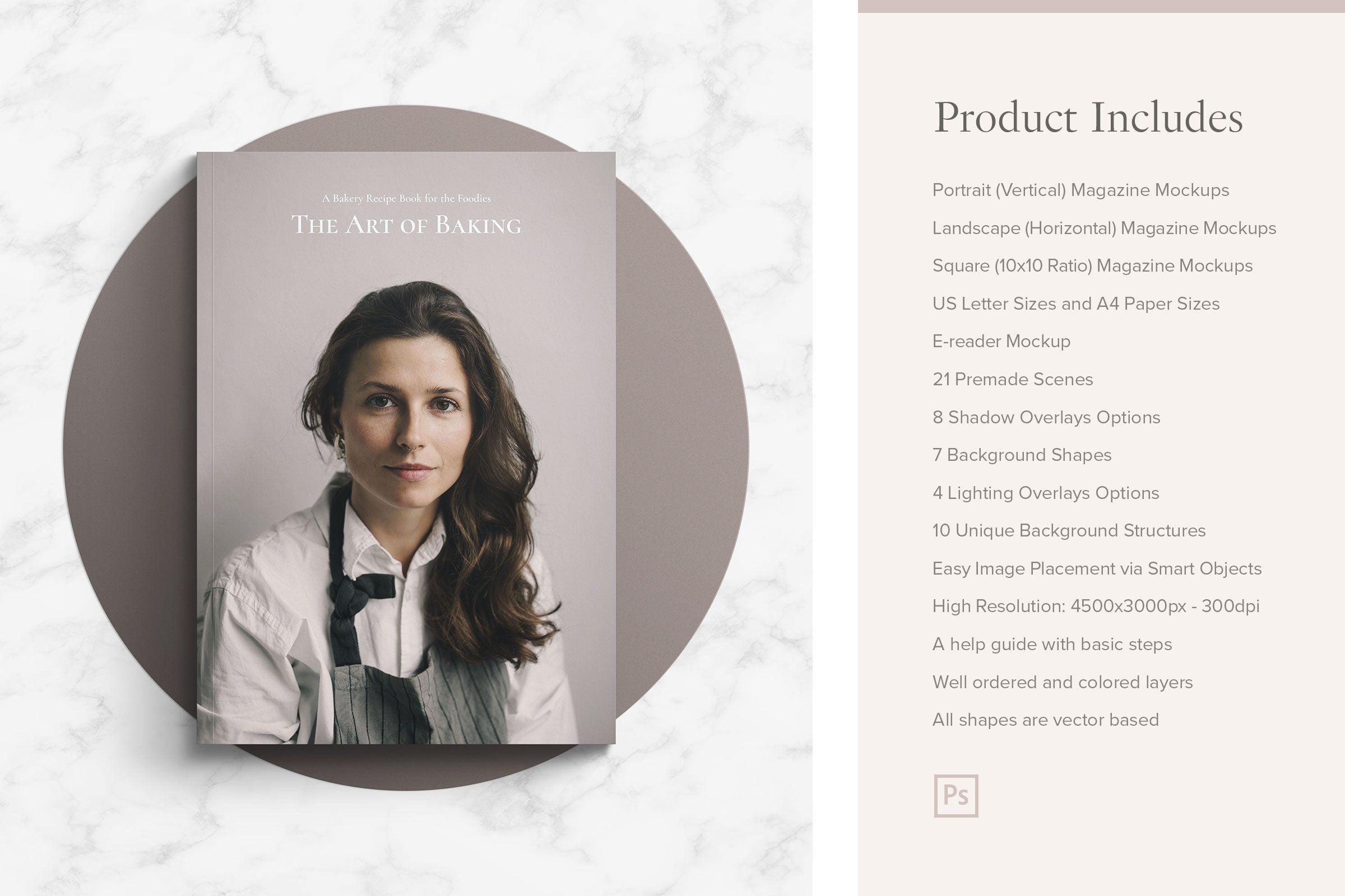 Hierbei handelt es sich um ein hochauflösendes Magazin-Mockup, das mit Adobe Photoshop kompatibel ist und sich durch sein natürliches Aussehen und die vielen Optionen auszeichnet. Das Magazincover, das gefaltete Magazin und die Magazin-Spread-Mockups sind im A4- und US-Letter-Format erhältlich. Der Download bietet 21 vorgefertigte Szenen, 10 Hintergrundtexturen, natürliche Schatten, Beleuchtungsüberlagerungsoptionen und vieles mehr! Die Modelle lassen sich sehr einfach anpassen, indem Sie Ihre Bilder einfach über intelligente Objekte platzieren und die Beleuchtungs-, Textur- und Schattenoptionen umschalten. Es gibt auch eine Hilfeanleitung mit den grundlegenden Schritten zur Verwendung dieses Produkts. Durch die zahlreichen Möglichkeiten, diese Modelle an Ihre eigenen Bedürfnisse anzupassen, können Sie realistische und authentische Szenen erstellen.