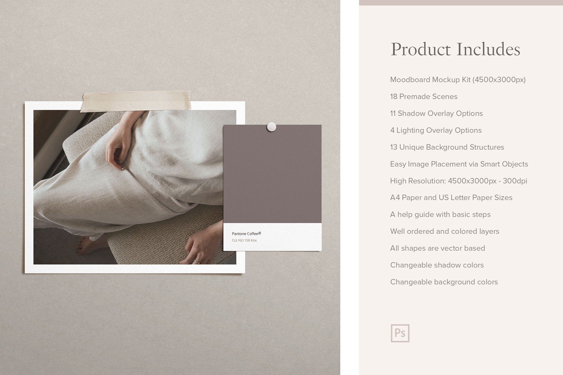 Hierbei handelt es sich um ein hochauflösendes Moodboard-Mockup-Kit, das mit Adobe Photoshop kompatibel ist und sich durch sein natürliches Aussehen und die vielen Optionen auszeichnet. Der Download bietet 18 vorgefertigte Szenen, 13 Hintergrundtexturen, natürliche Schatten, Beleuchtungsüberlagerungsoptionen und vieles mehr! Die Modelle lassen sich sehr einfach anpassen, indem Sie Ihre Bilder einfach über intelligente Objekte platzieren und die Beleuchtungs-, Textur- und Schattenoptionen umschalten. Es gibt auch eine Hilfeanleitung mit den grundlegenden Schritten zur Verwendung dieses Produkts. Durch die zahlreichen Möglichkeiten, diese Modelle an Ihre eigenen Bedürfnisse anzupassen, können Sie realistische und authentische Szenen erstellen.