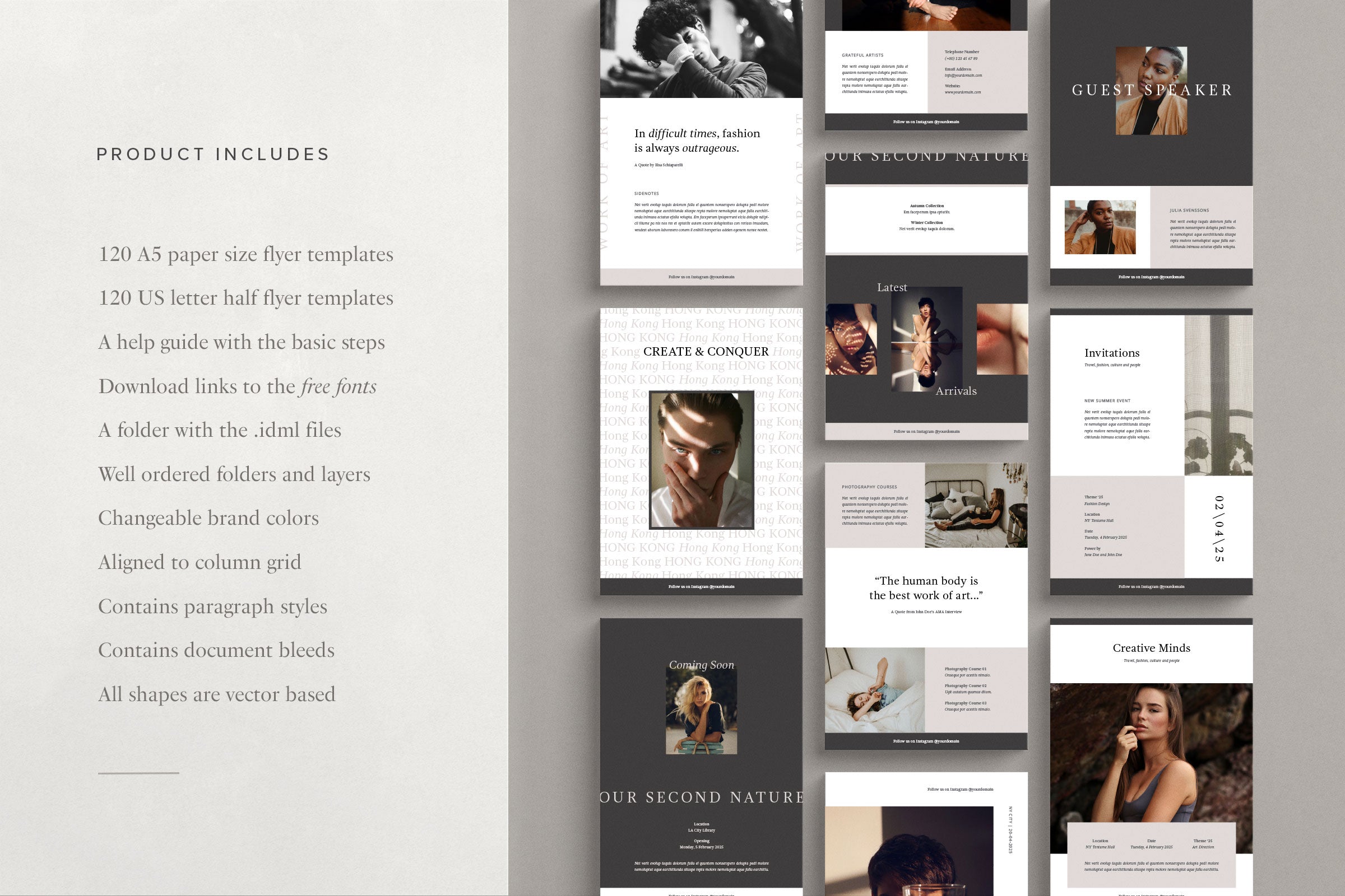 Dieses Postkarten-/Flyer-Paket enthält 120 druckbare Vorlagen. Jedes Design ist im A5- und US-Letter-Halbformat erhältlich. Mit Adobe InDesign können Sie die Postkarten/Flyer ganz einfach an Ihre eigenen Bedürfnisse anpassen. Der Download umfasst IDML-Dateien, Dokumentanschnitte, Absatzstile, separate Ebenen, Schriftarten und alle Platzhalterbilder! Es gibt auch eine Hilfeanleitung mit den grundlegenden Schritten zur Verwendung dieses Produkts. Mit diesen professionellen Vorlagen können Sie Ihre Geschichte auf einzigartige Weise erzählen.
