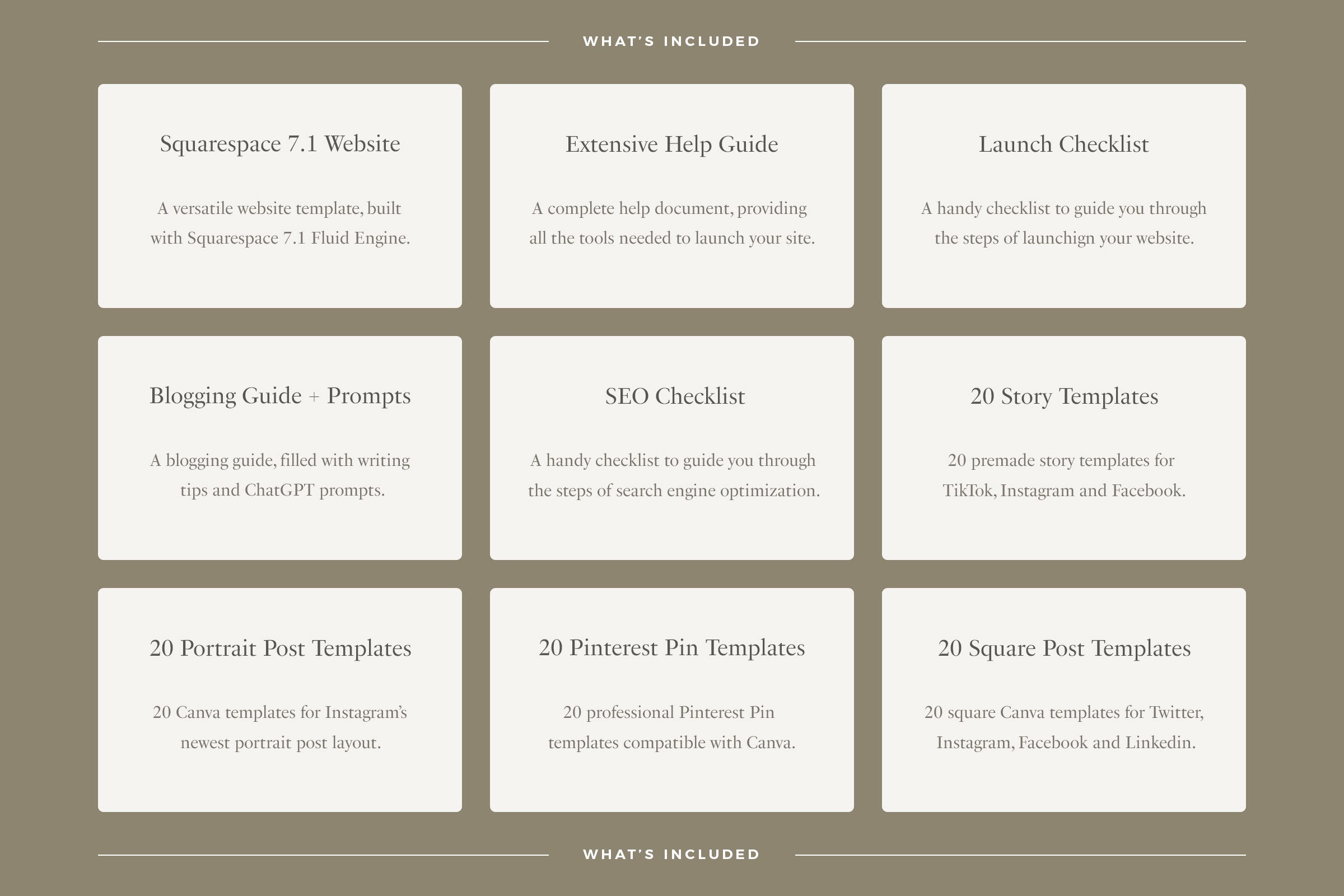 Als Bonus sind im Download 80 vorgefertigte Social-Media-Vorlagen für Canva enthalten, darunter 20 Story-Vorlagen, 20 quadratische Vorlagen, 20 Vorlagen im Hochformat und 20 Pinterest-Pin-Vorlagen. Diese Vorlagen sind im Stil Ihrer Website gestaltet und erleichtern die Werbung für Ihre neue Website und Ihr Unternehmen auf allen Ihren Social-Media-Plattformen.