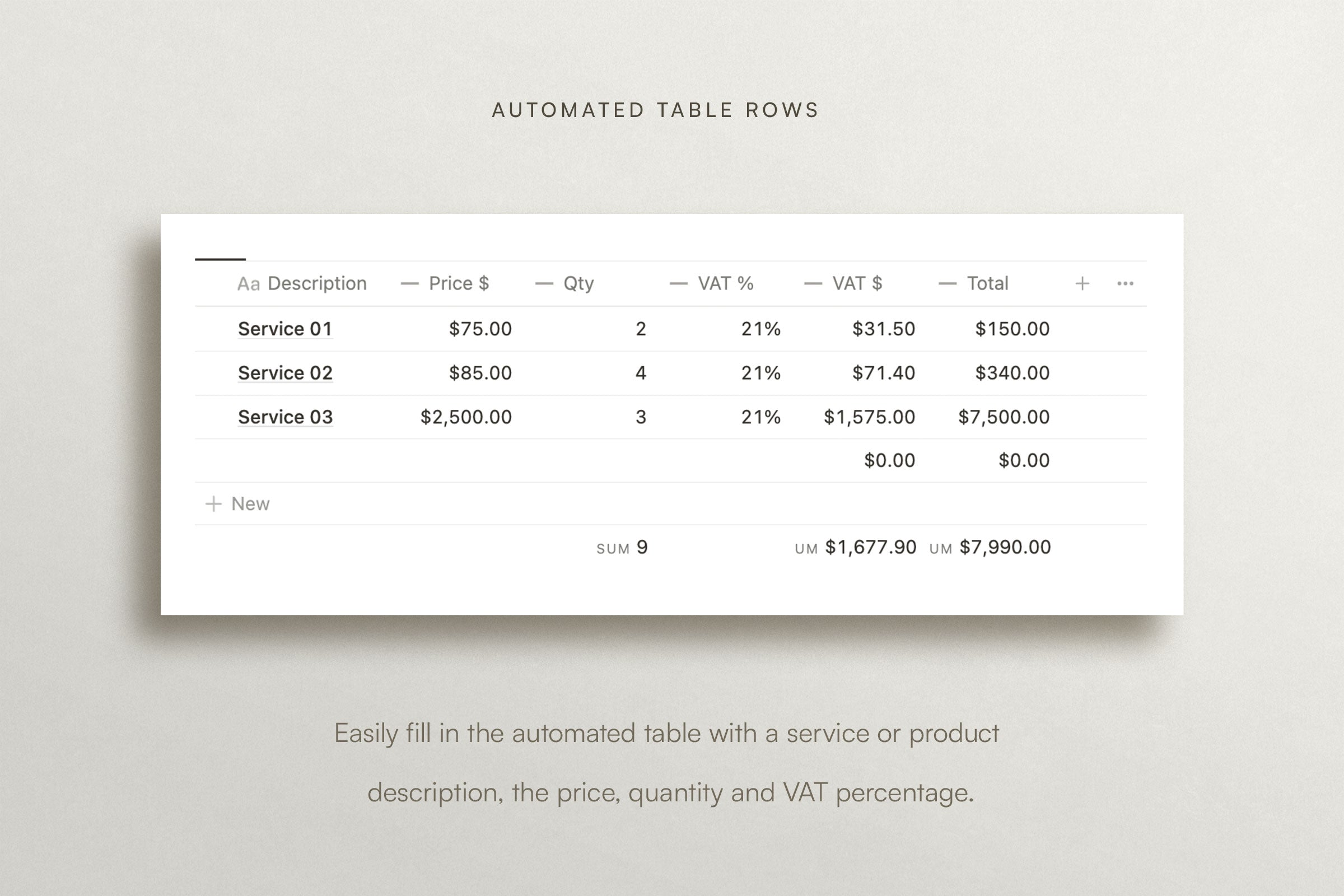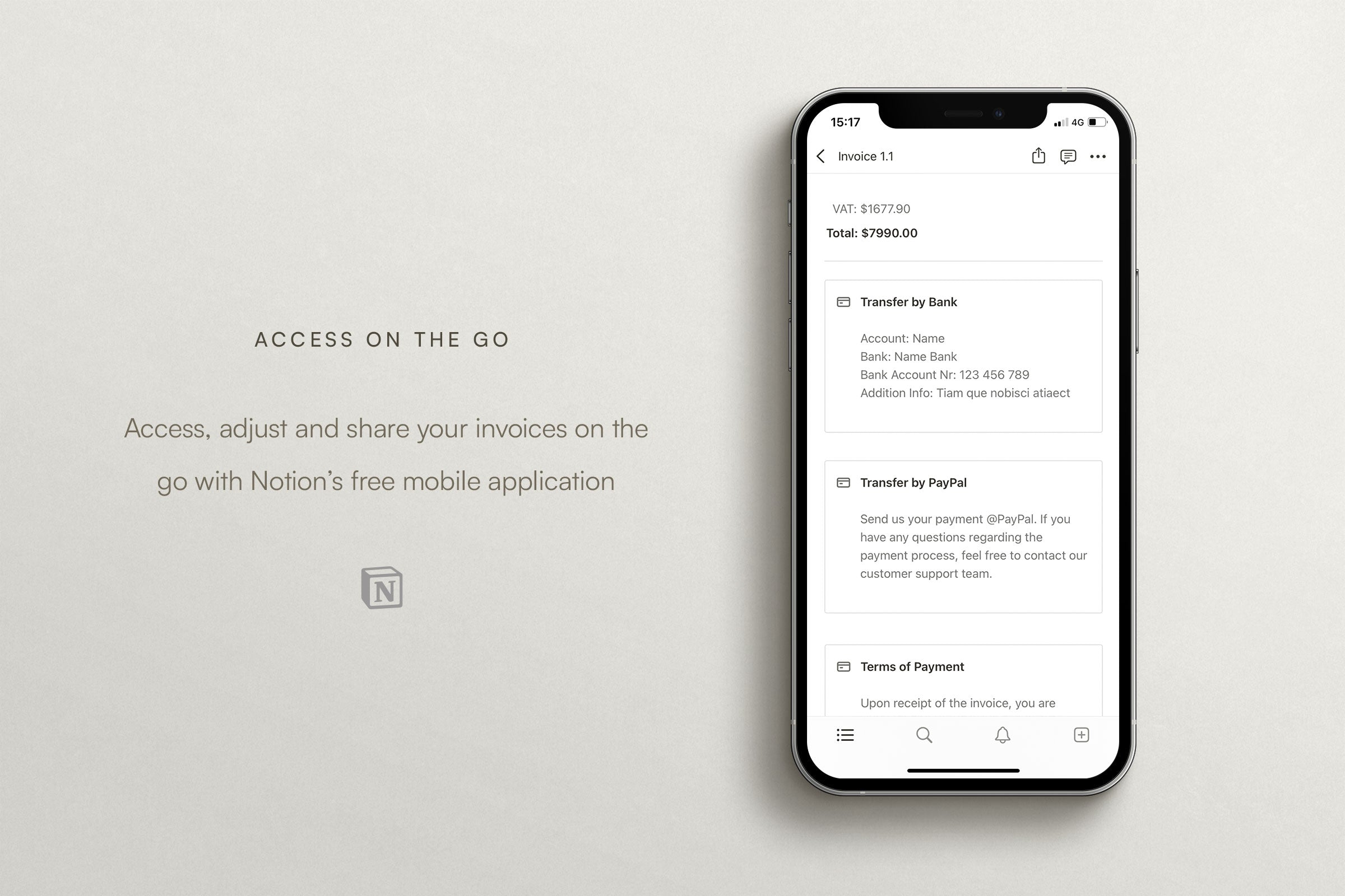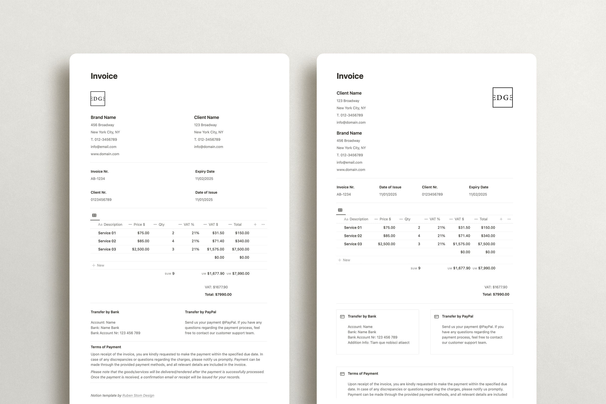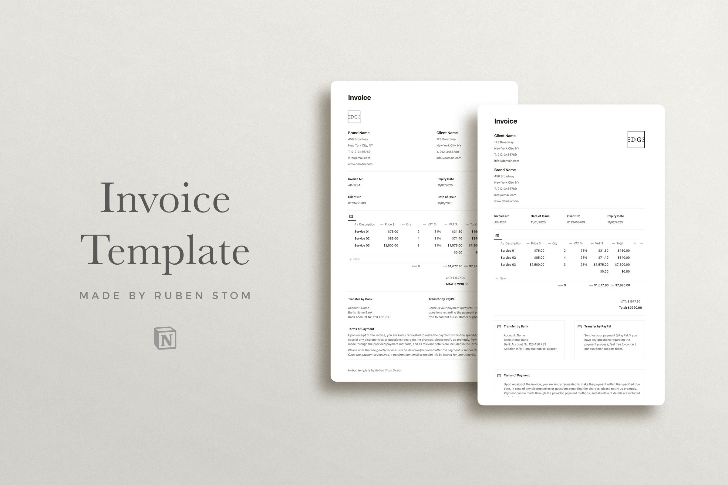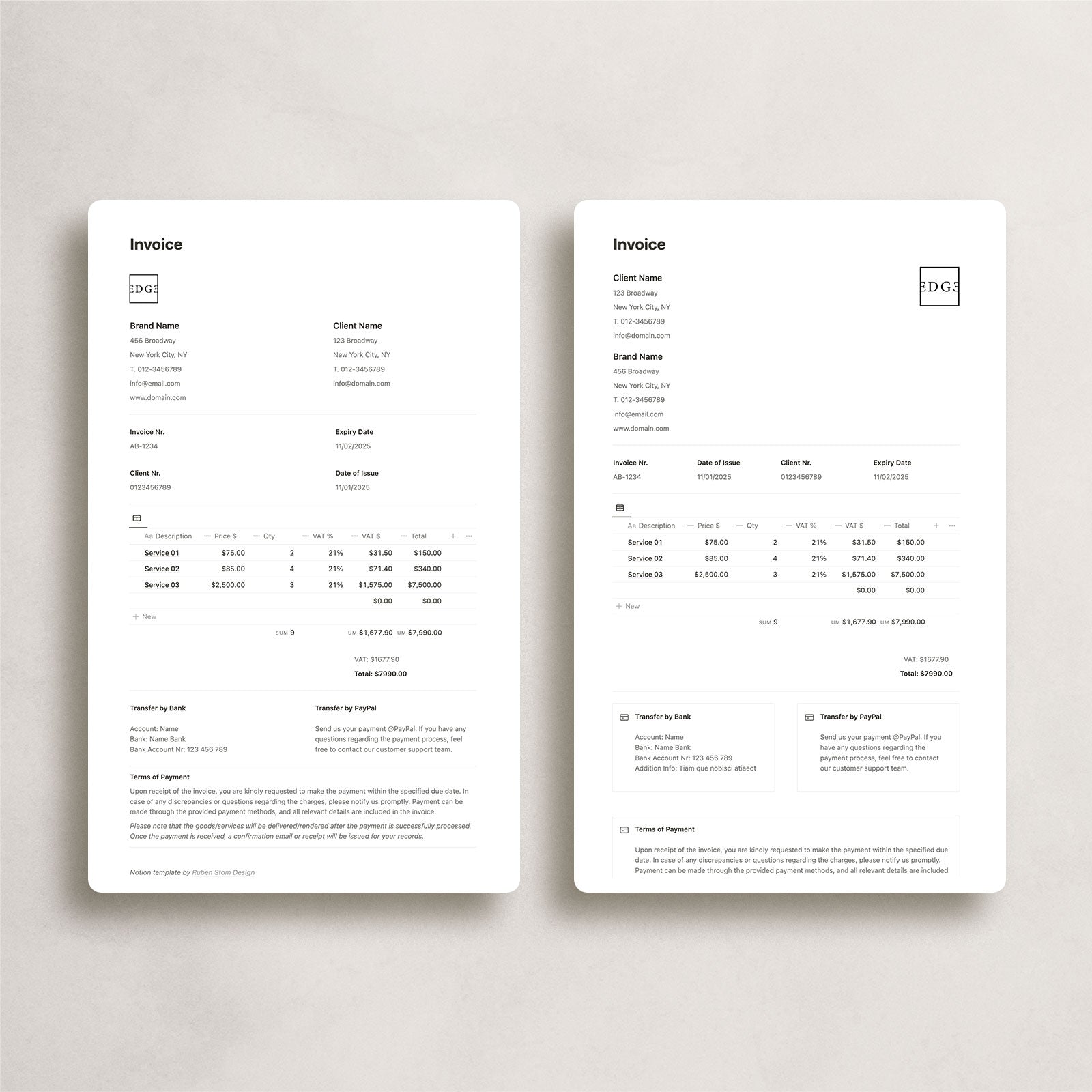 Rationalisez votre processus de facturation et prenez le contrôle de votre facturation avec ces modèles de facture Notion. Ce produit comprend deux modèles de factures professionnels et épurés qui simplifieront votre expérience de facturation. Avec ces modèles de factures, créer et gérer des factures professionnelles n'a jamais été aussi efficace.