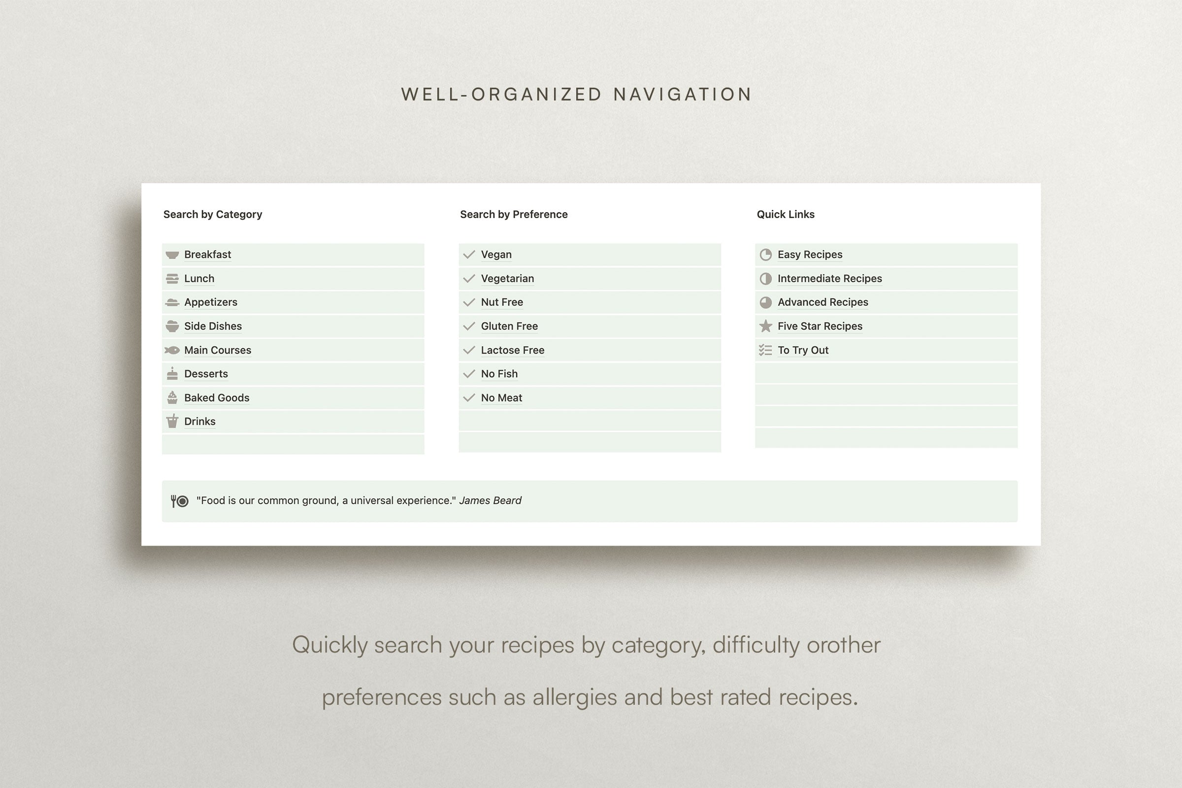 Il s'agit d'un modèle Notion premium pour prendre le contrôle de vos recettes comme jamais auparavant. Ce produit comprend un modèle de recette esthétique et organisé, compatible avec Notion. Organisez et accédez facilement à vos plats préférés. Que vous soyez un chef chevronné ou un novice en cuisine, ce modèle est conçu pour faciliter la gestion de vos recettes !