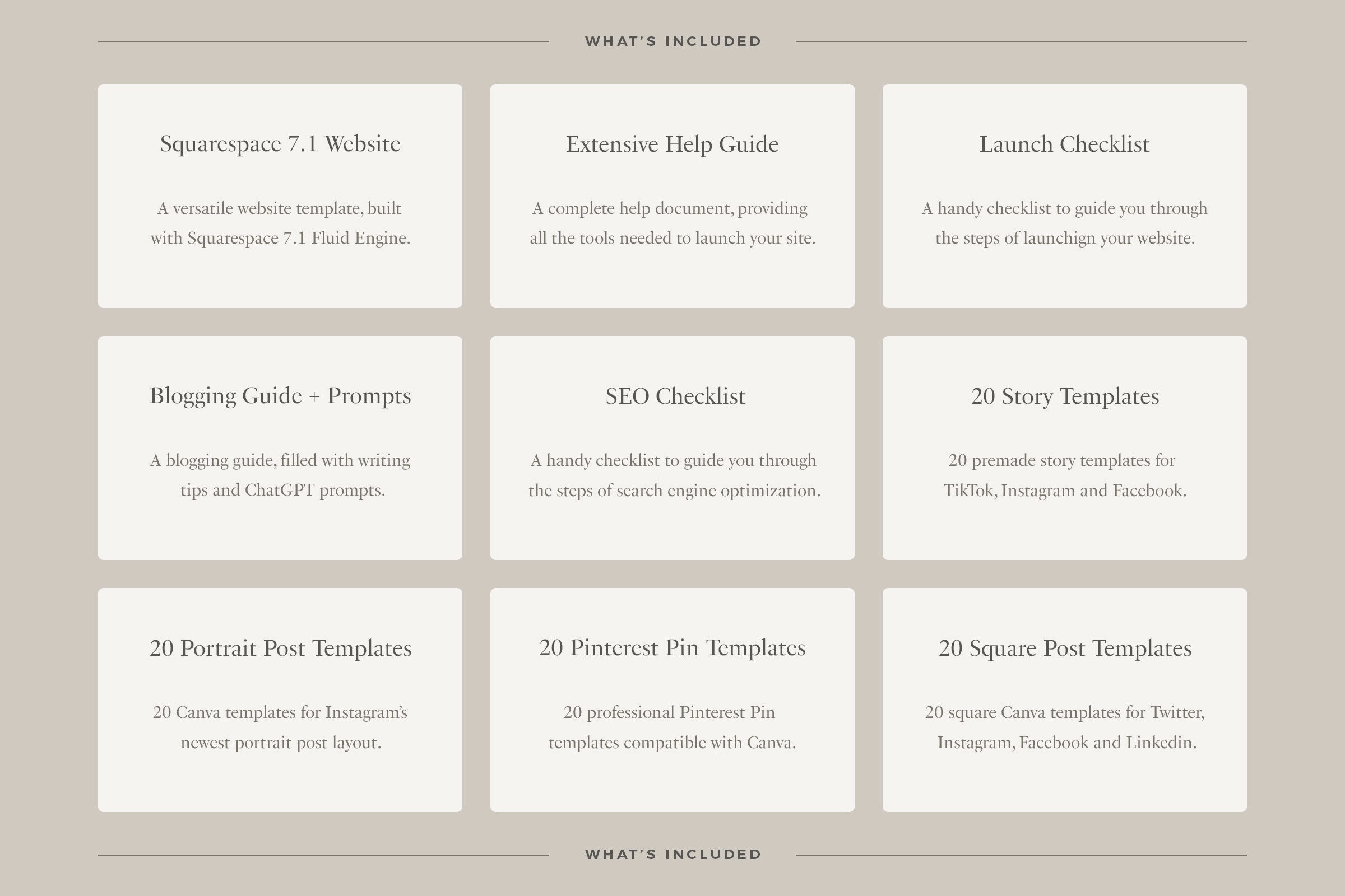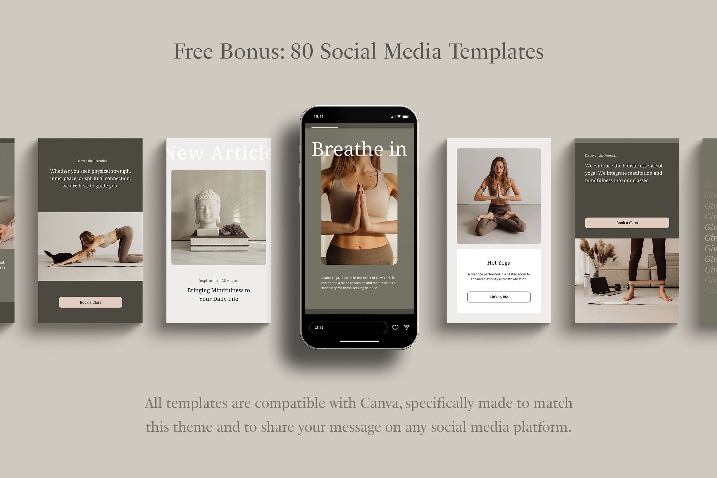 As a bonus, are 80 premade social media templates for Canva included in the download, consisting of 20 story templates, 20 square sized templates, 20 portrait sized templates, and 20 Pinterest pin templates. These templates are designed in the style of your website, making it easy to promote your new website and business across all your social media platforms.