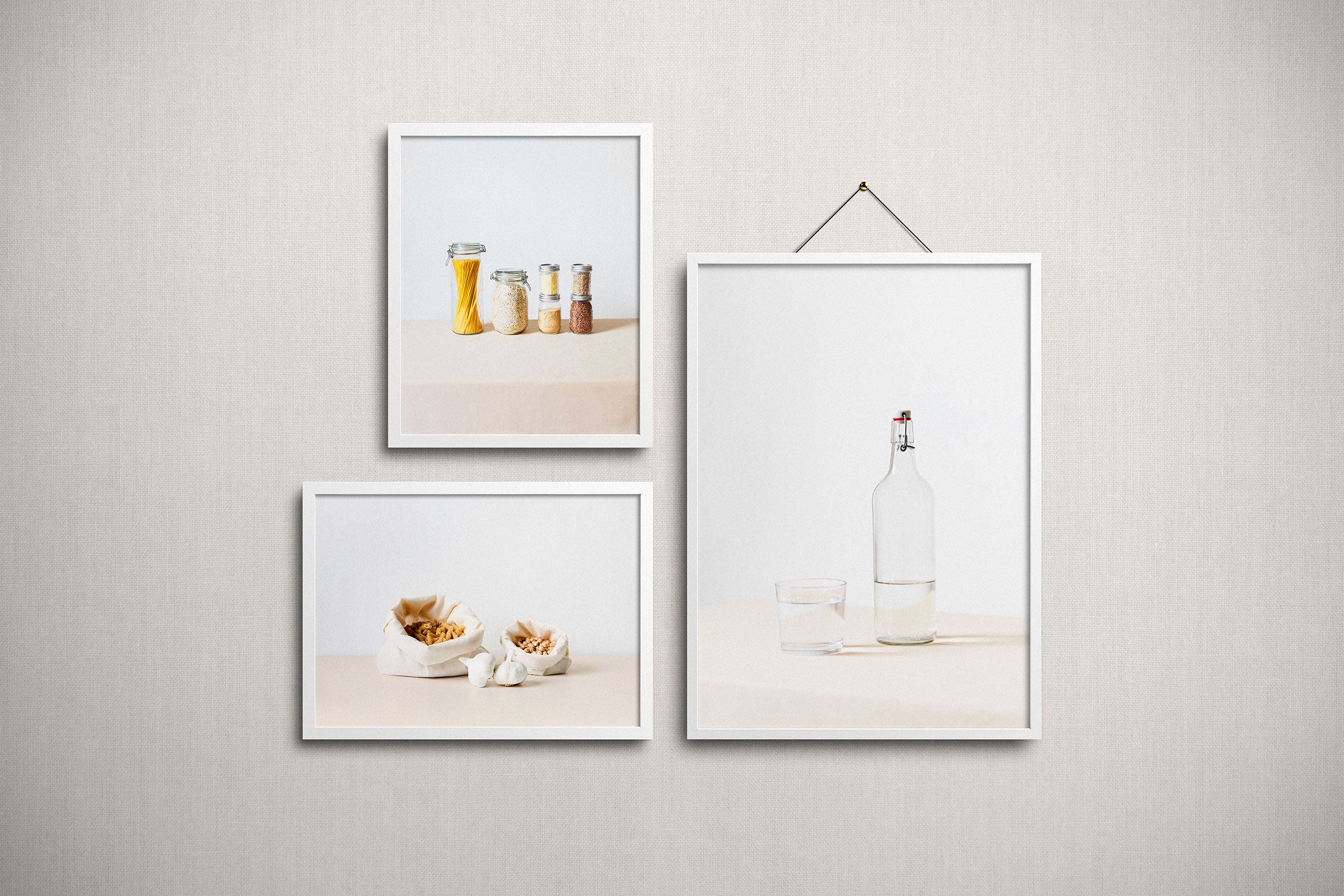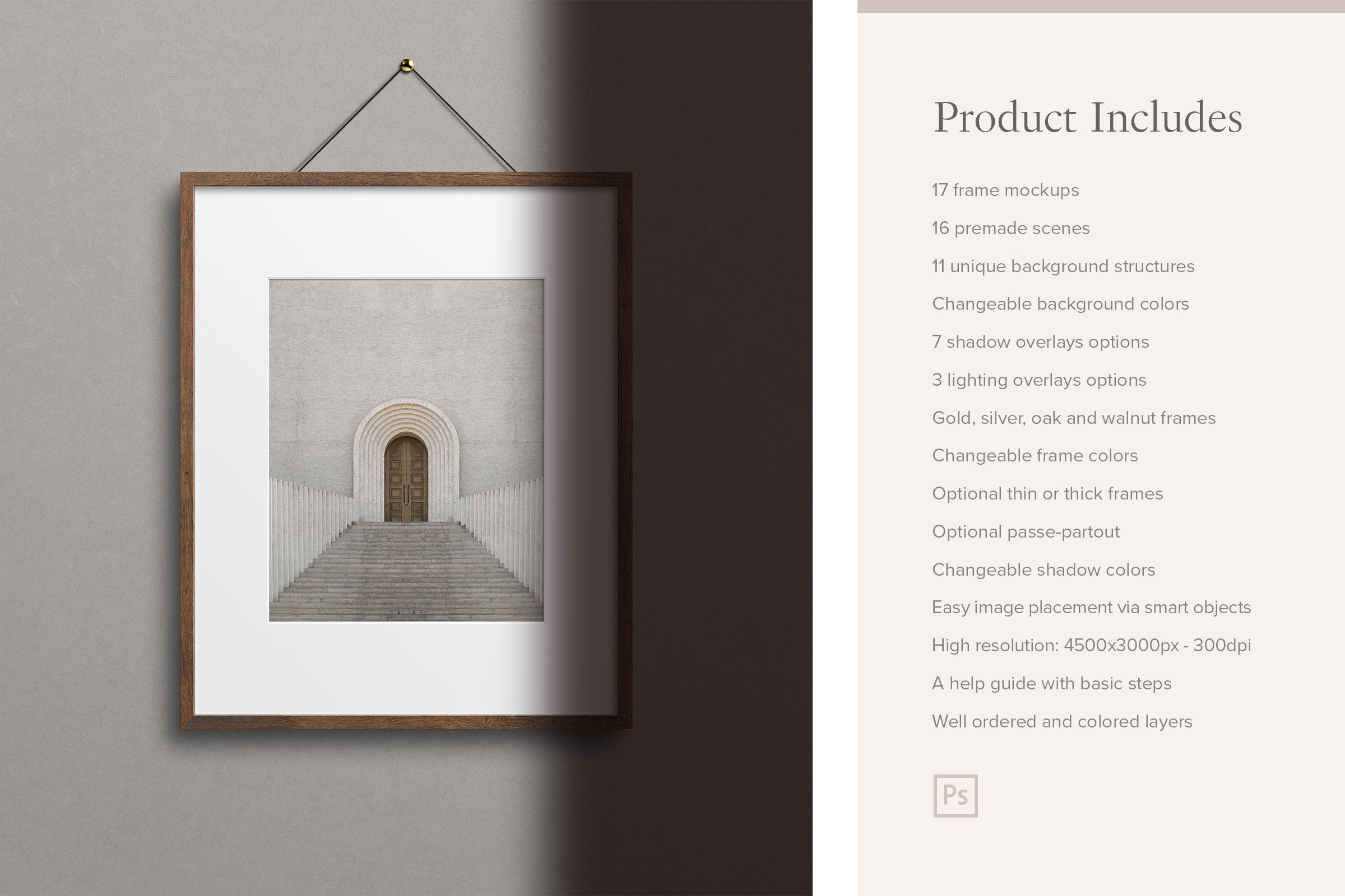 This is a high resolution frame mockup kit, compatible with Adobe Photoshop and distinctive because of its natural look and many options. The mockup comes in 17 different sizes. The download features 16 premade scenes, 11 background textures, natural shadows, lighting overlay options and much more! The mockups are very easy to adjust by simply placing your images via smart objects and toggling on lighting, texture, shadow and frame options. There's also a help guide included with the basic steps how to use this product. The vast amount of options to customize these mockups to your own needs enables you to create realistic and authentic scenes.